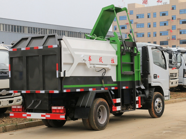 該車(chē)箱體有效容積:5立方,箱體前部側(cè)面帶有掛桶提升機(jī)構(gòu),可自動(dòng)舉升垃圾桶倒入垃圾,帶自卸功能,尾部裝有橡膠密封條,防污水滴漏,杜絕二次污染。掛桶垃圾車(chē)可根據(jù)客戶要求搭配120升或240升塑料桶和鐵桶。