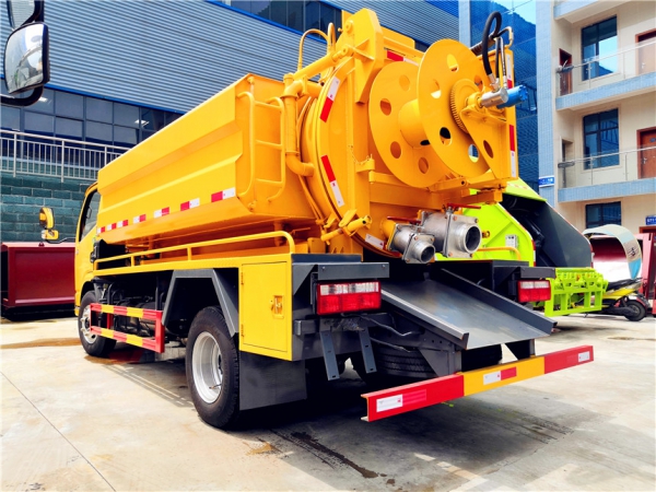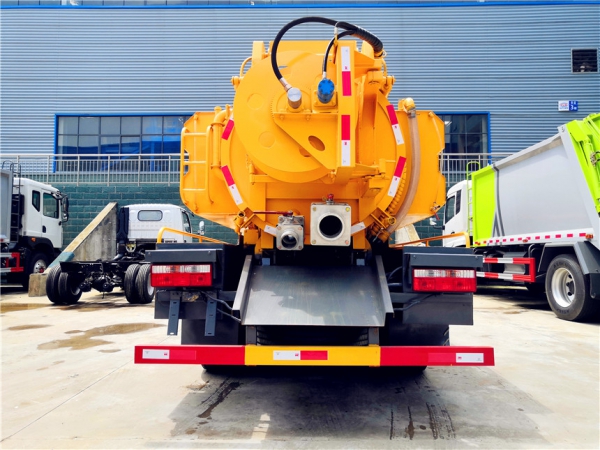 吸污部分:3.8方污罐,罐體5mmQ235優質碳鋼,配淄博SK-9水循環泵(北方地區可選裝真空油泵),8米吸污管一根,進氣管加過濾網,防溢閥加高,后蓋卡扣鎖緊,前視污亮管,后尾部加裝1個力拓牌**mm、150mm的球閥均帶進出口,罐體帶舉升功能,后門帶液壓開啟。